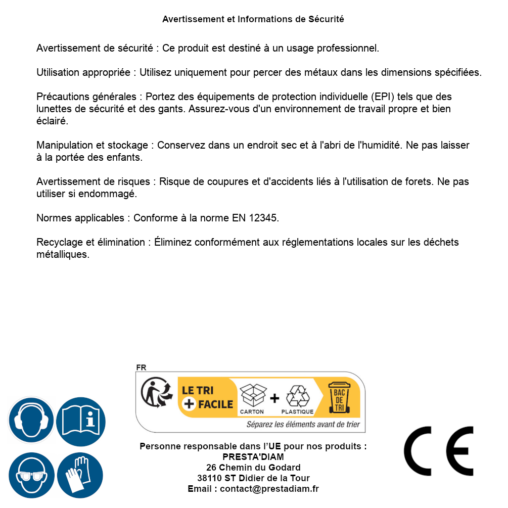 | WARNUNG und SICHERHEIT | Avertissement de sécurité : Ce produit est destiné à un usage professionnel.Utilisation appropriée : Utilisez uniquement pour percer des métaux dans les dimensions spécifiées.Précautions générales : Portez des équipements de protection individuelle (EPI) tels que des lunettes de sécurité et des gants. Assurez-vous d'un environnement de travail propre et bien éclairé.Manipulation et stockage : Conservez dans un endroit sec et à l'abri de l'humidité. Ne pas laisser à la portée des enfants.Avertissement de risques : Risque de coupures et d'accidents liés à l'utilisation de forets. Ne pas utiliser si endommagé.Normes applicables : Conforme à la norme EN 12345.Recyclage et élimination : Éliminez conformément aux réglementations locales sur les déchets métalliques. Identification de la personne responsable dans l’UE : Nom : PRESTA'DIAM. Adresse : 26 Chemin du Godard, 38110 ST Didier de la Tour (France). Email : contact@prestadiam.fr. |