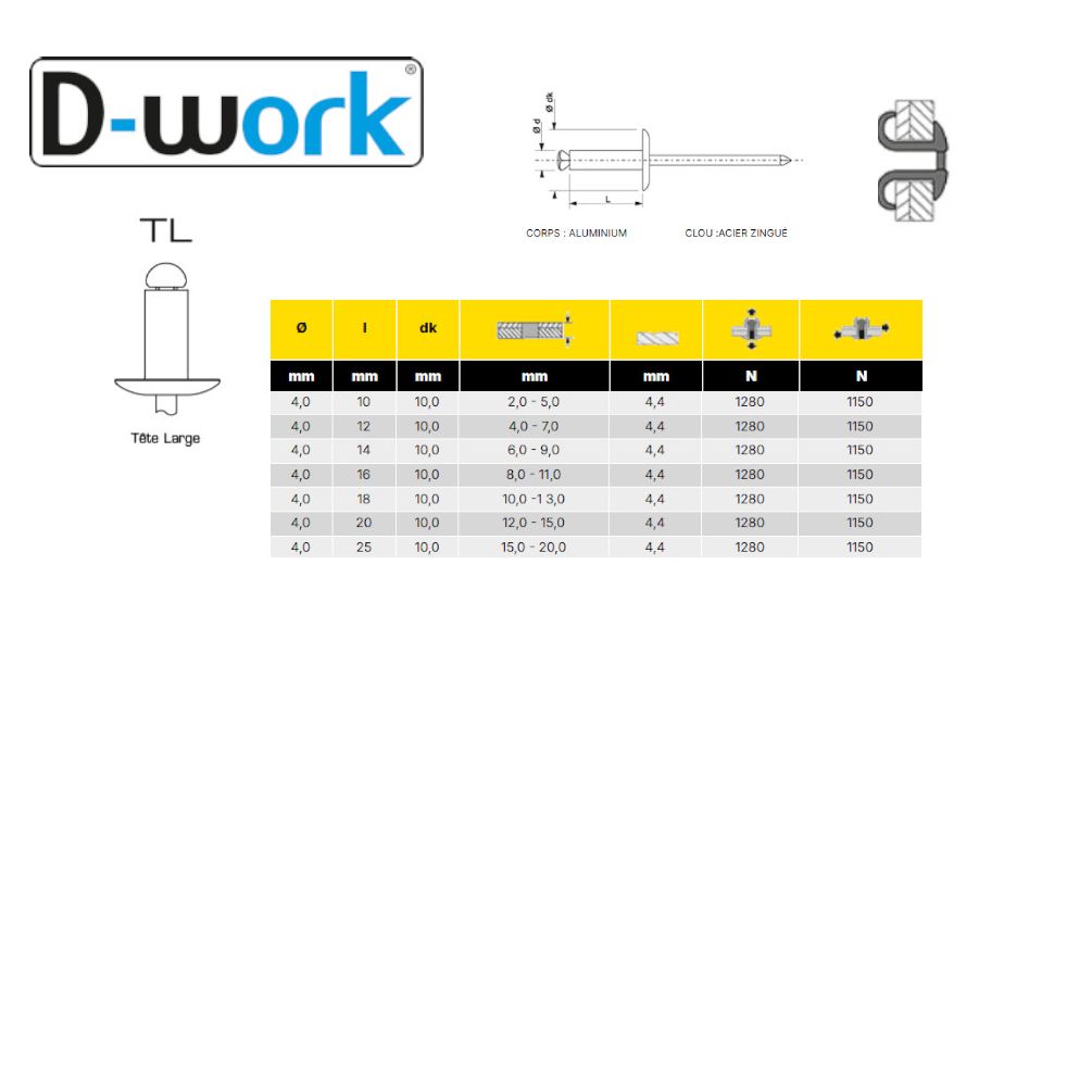 500 Rivets Aveugles Aluminium/Acier TR Gorivet ALX TRS 4x6 mm - Résistants et Faciles à Poser - D-Work