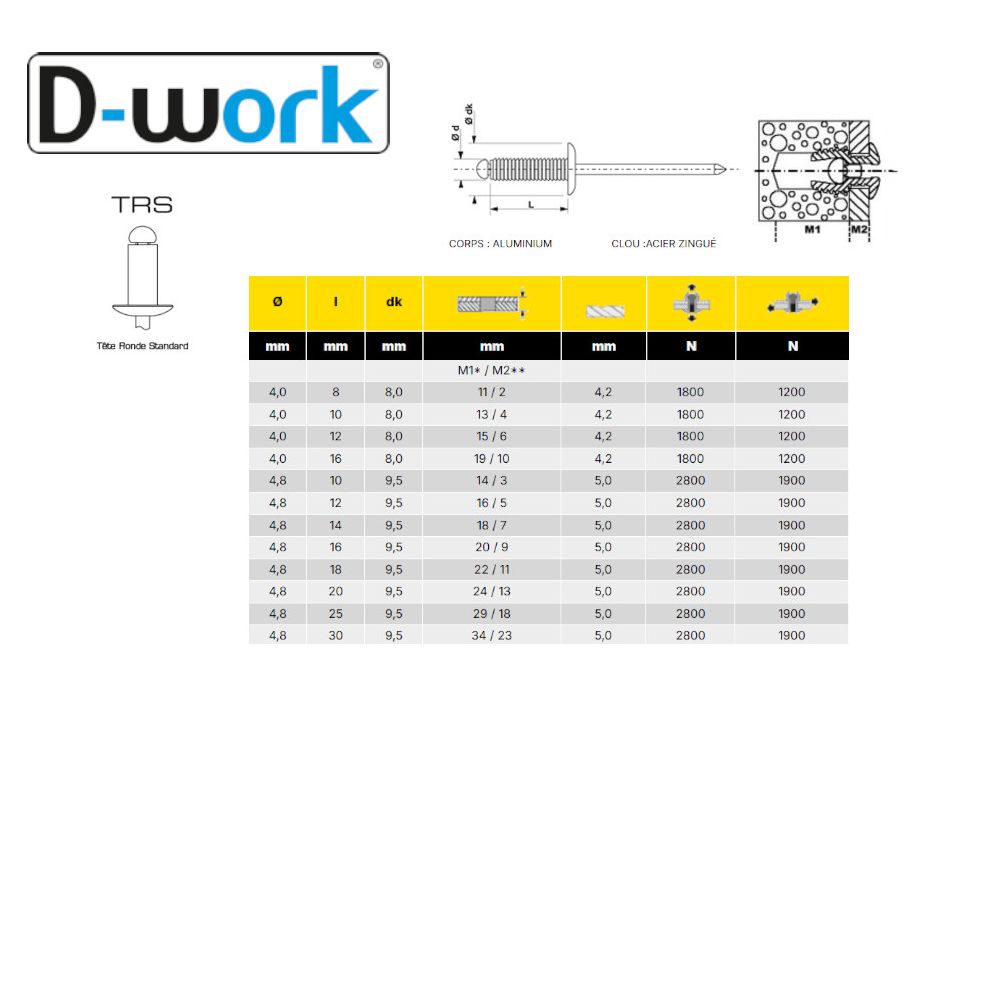 500 Rivets Aveugles Aluminium/Acier TR Gorivet ALX TRS 4x6 mm - Résistants et Faciles à Poser - D-Work