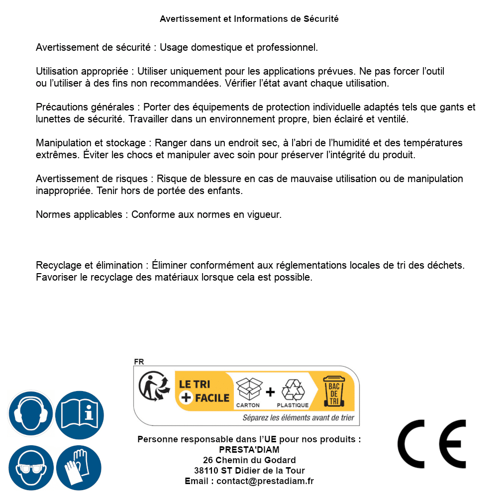 | WARNUNG und SICHERHEIT | Identification de la personne responsable dans l’UE : Nom : PRESTA'DIAM. Adresse : 26 Chemin du Godard, 38110 ST Didier de la Tour (France). Email : contact@prestadiam.fr. |
