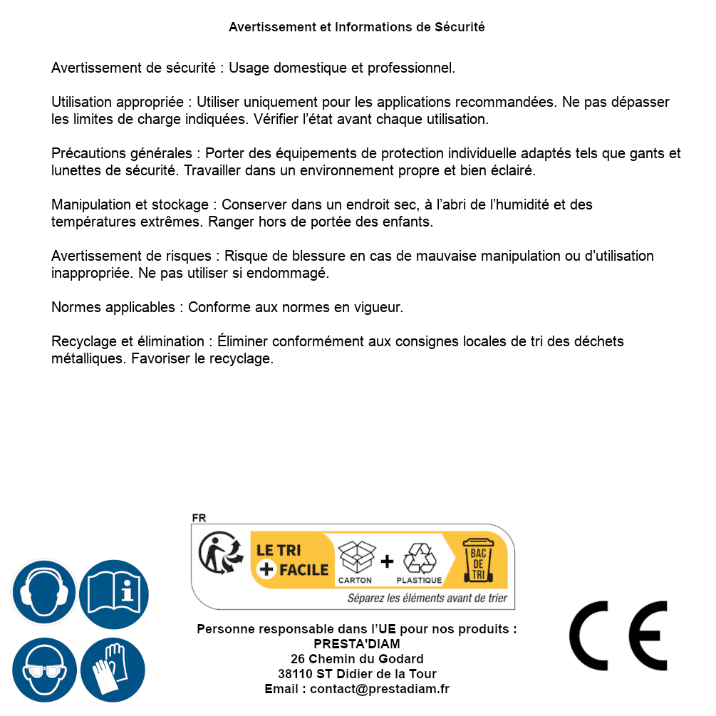 | WARNUNG und SICHERHEIT | Identification de la personne responsable dans l’UE : Nom : PRESTA'DIAM. Adresse : 26 Chemin du Godard, 38110 ST Didier de la Tour (France). Email : contact@prestadiam.fr. |