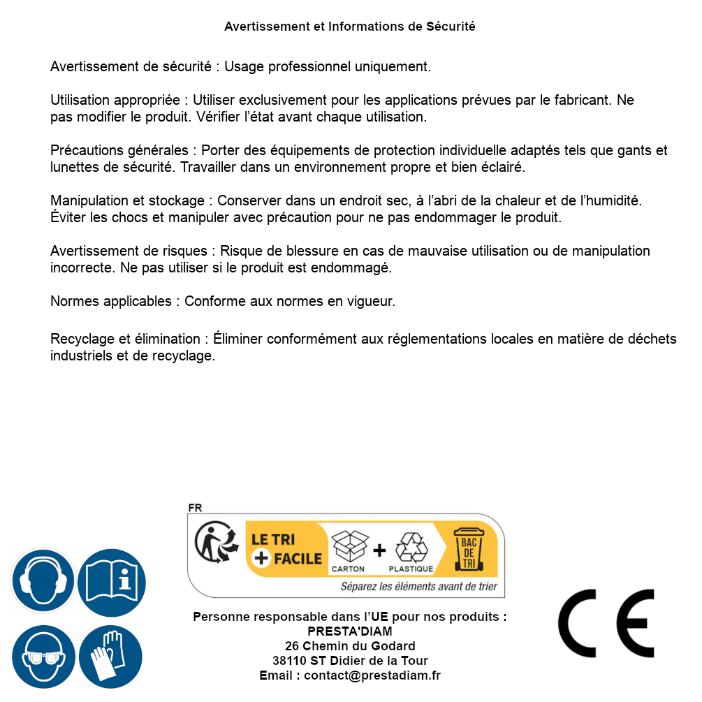 | WARNUNG und SICHERHEIT | Identification de la personne responsable dans l’UE : Nom : PRESTA'DIAM. Adresse : 26 Chemin du Godard, 38110 ST Didier de la Tour (France). Email : contact@prestadiam.fr. |