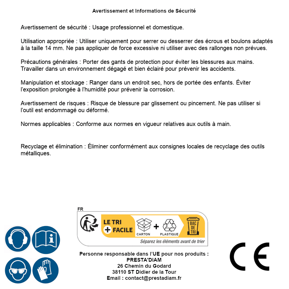 | WARNUNG und SICHERHEIT | Identification de la personne responsable dans l’UE : Nom : PRESTA'DIAM. Adresse : 26 Chemin du Godard, 38110 ST Didier de la Tour (France). Email : contact@prestadiam.fr. |