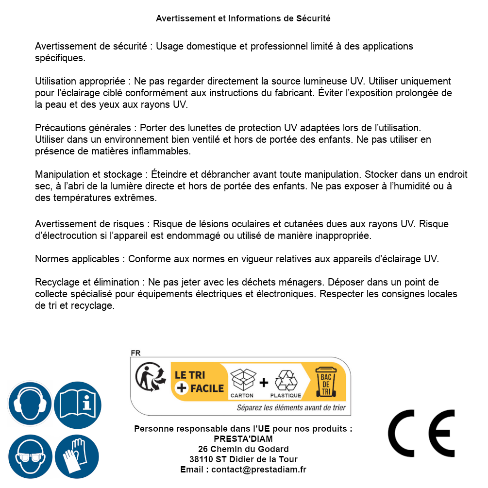 | WARNUNG und SICHERHEIT | Identification de la personne responsable dans l’UE : Nom : PRESTA'DIAM. Adresse : 26 Chemin du Godard, 38110 ST Didier de la Tour (France). Email : contact@prestadiam.fr. |