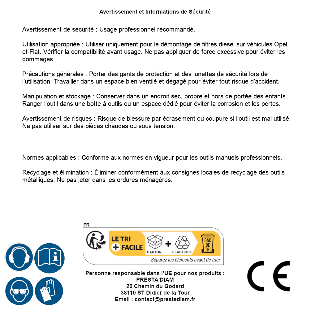 | WARNUNG und SICHERHEIT | Identification de la personne responsable dans l’UE : Nom : PRESTA'DIAM. Adresse : 26 Chemin du Godard, 38110 ST Didier de la Tour (France). Email : contact@prestadiam.fr. |