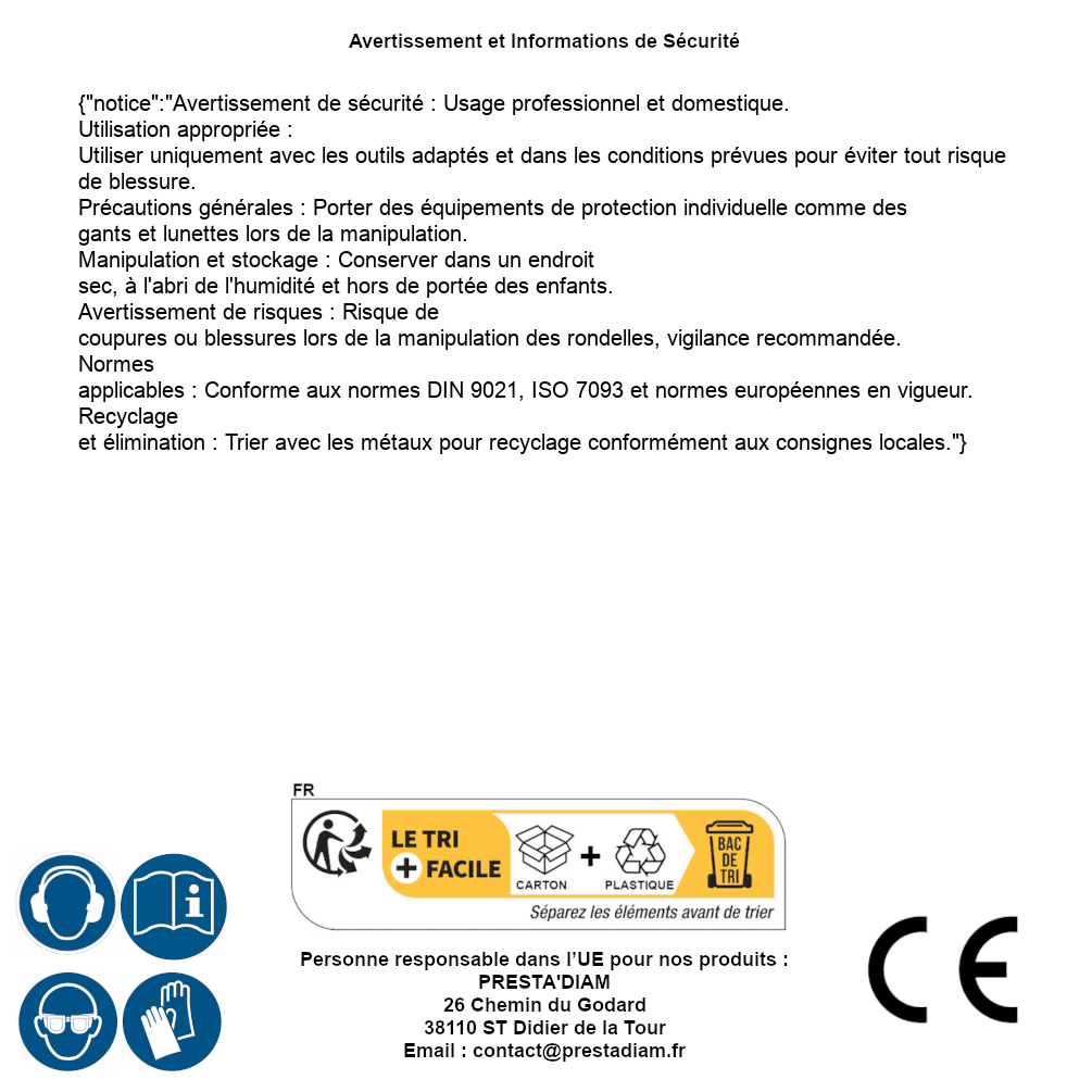 | WARNUNG und SICHERHEIT | Identification de la personne responsable dans l’UE : Nom : PRESTA'DIAM. Adresse : 26 Chemin du Godard, 38110 ST Didier de la Tour (France). Email : contact@prestadiam.fr. |