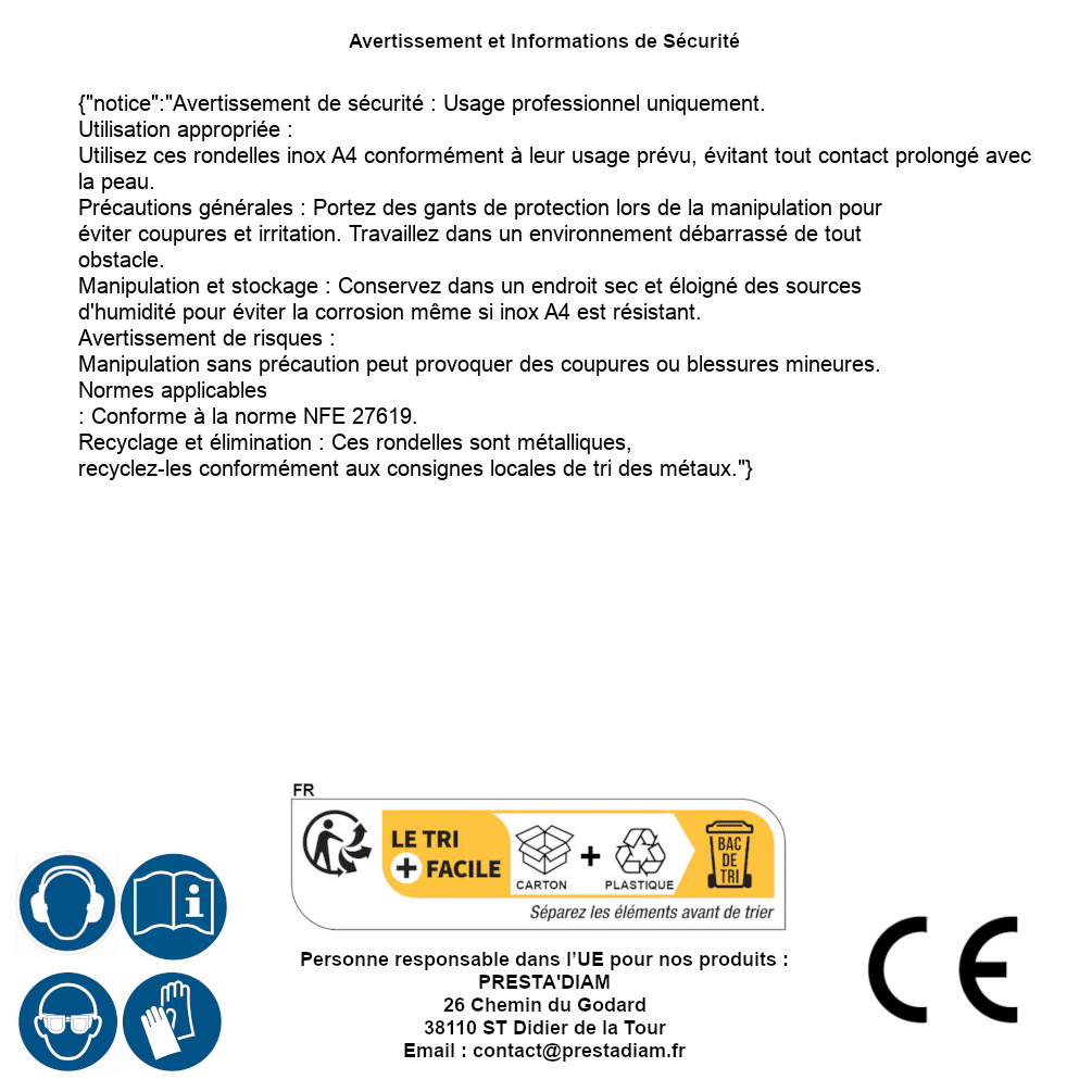 | WARNUNG und SICHERHEIT | Identification de la personne responsable dans l’UE : Nom : PRESTA'DIAM. Adresse : 26 Chemin du Godard, 38110 ST Didier de la Tour (France). Email : contact@prestadiam.fr. |