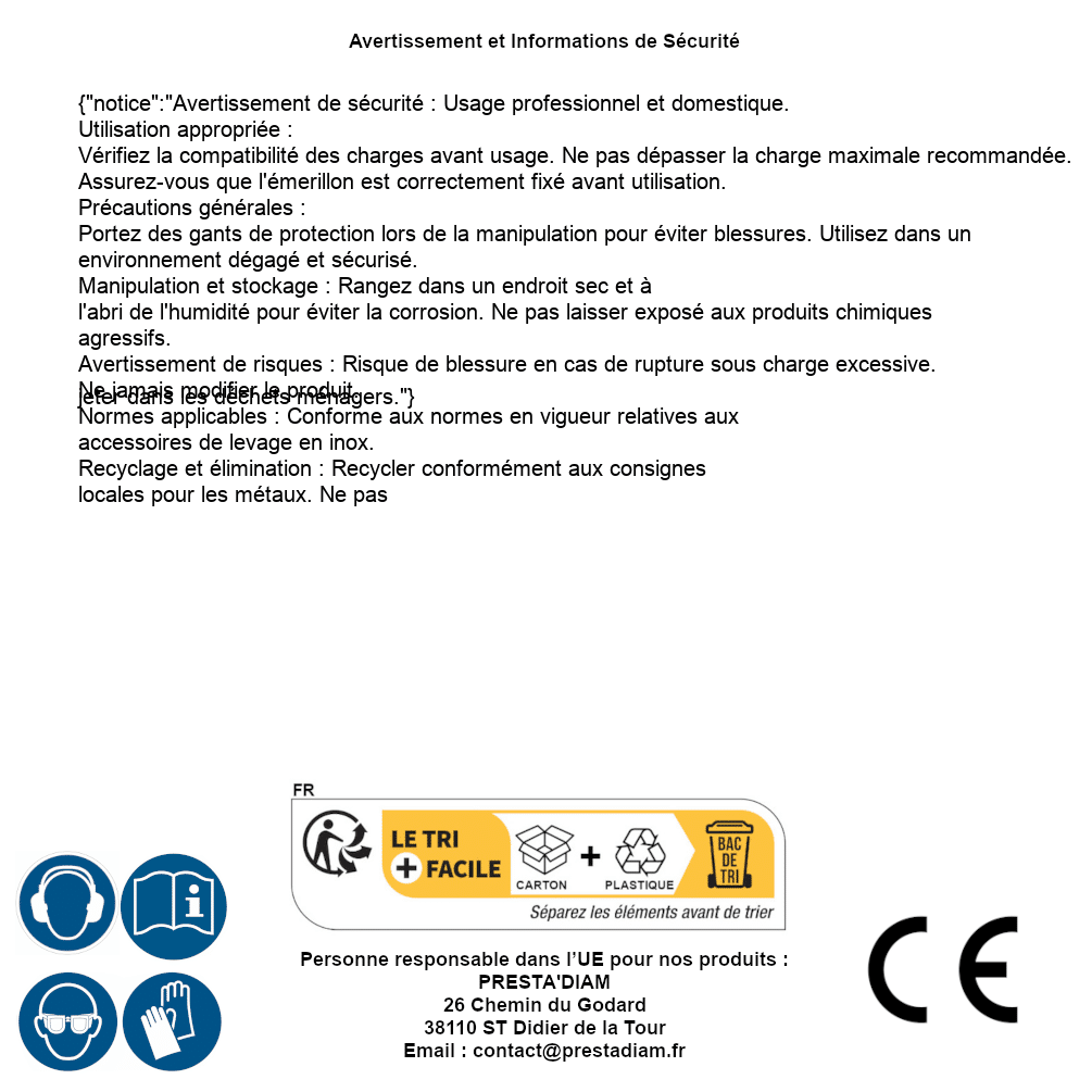 | WARNUNG und SICHERHEIT | Identification de la personne responsable dans l’UE : Nom : PRESTA'DIAM. Adresse : 26 Chemin du Godard, 38110 ST Didier de la Tour (France). Email : contact@prestadiam.fr. |