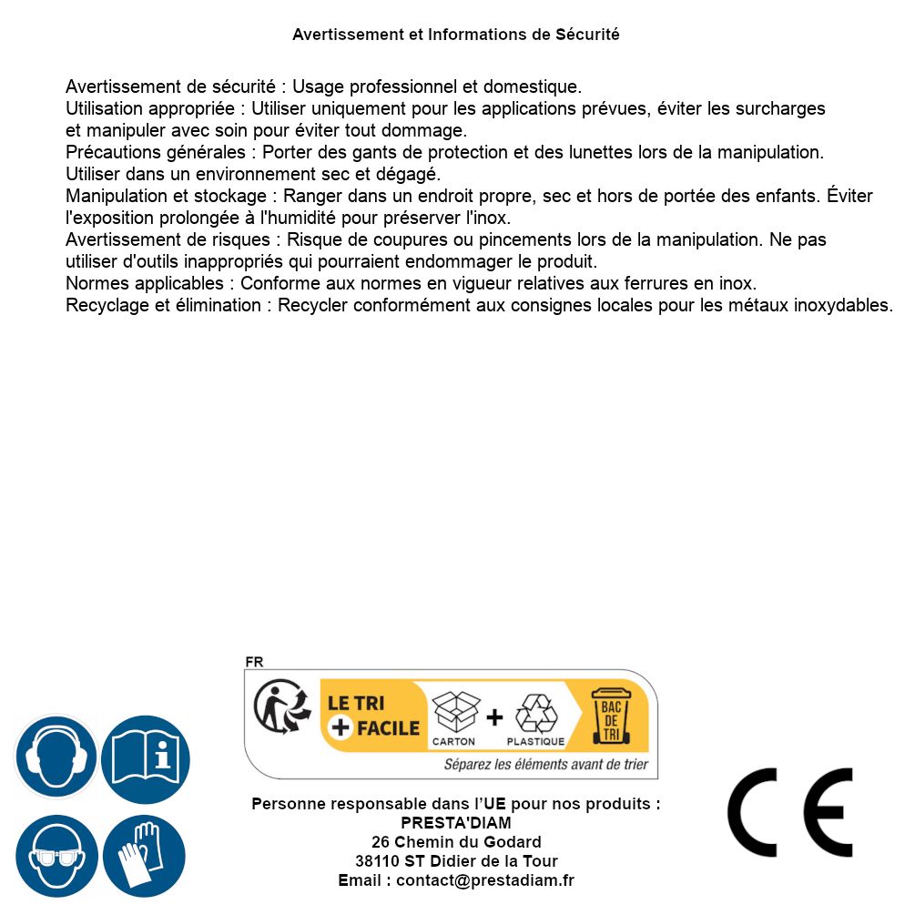 | WARNUNG und SICHERHEIT | Identification de la personne responsable dans l’UE : Nom : PRESTA'DIAM. Adresse : 26 Chemin du Godard, 38110 ST Didier de la Tour (France). Email : contact@prestadiam.fr. |