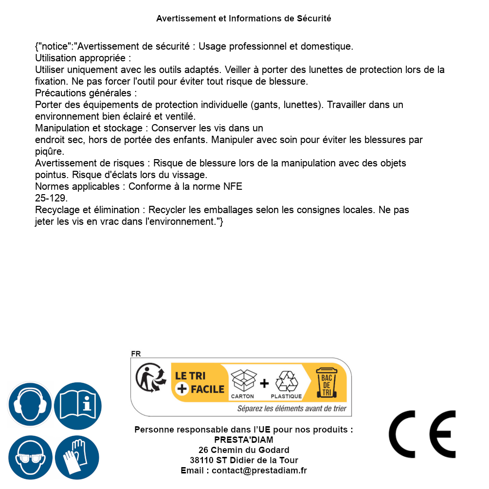 | WARNUNG und SICHERHEIT | Identification de la personne responsable dans l’UE : Nom : PRESTA'DIAM. Adresse : 26 Chemin du Godard, 38110 ST Didier de la Tour (France). Email : contact@prestadiam.fr. |