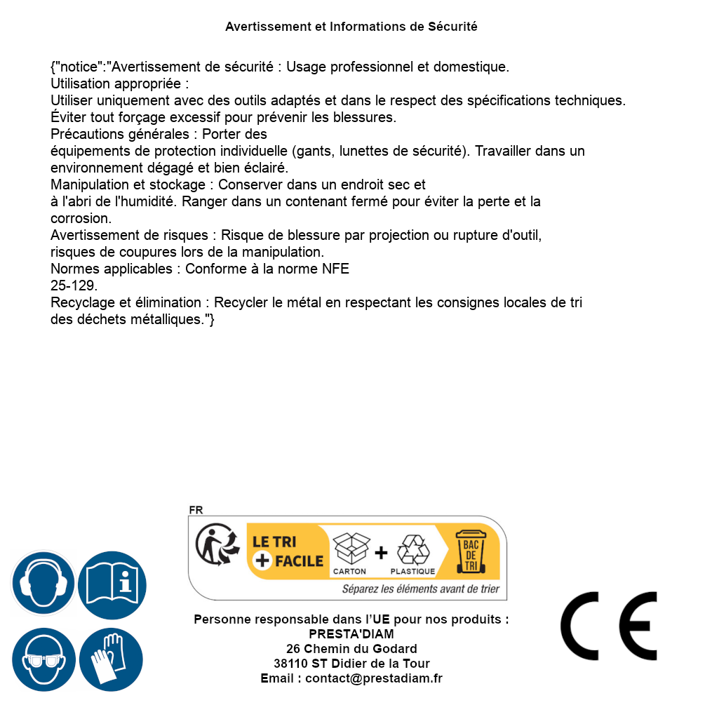 | WARNUNG und SICHERHEIT | Identification de la personne responsable dans l’UE : Nom : PRESTA'DIAM. Adresse : 26 Chemin du Godard, 38110 ST Didier de la Tour (France). Email : contact@prestadiam.fr. |