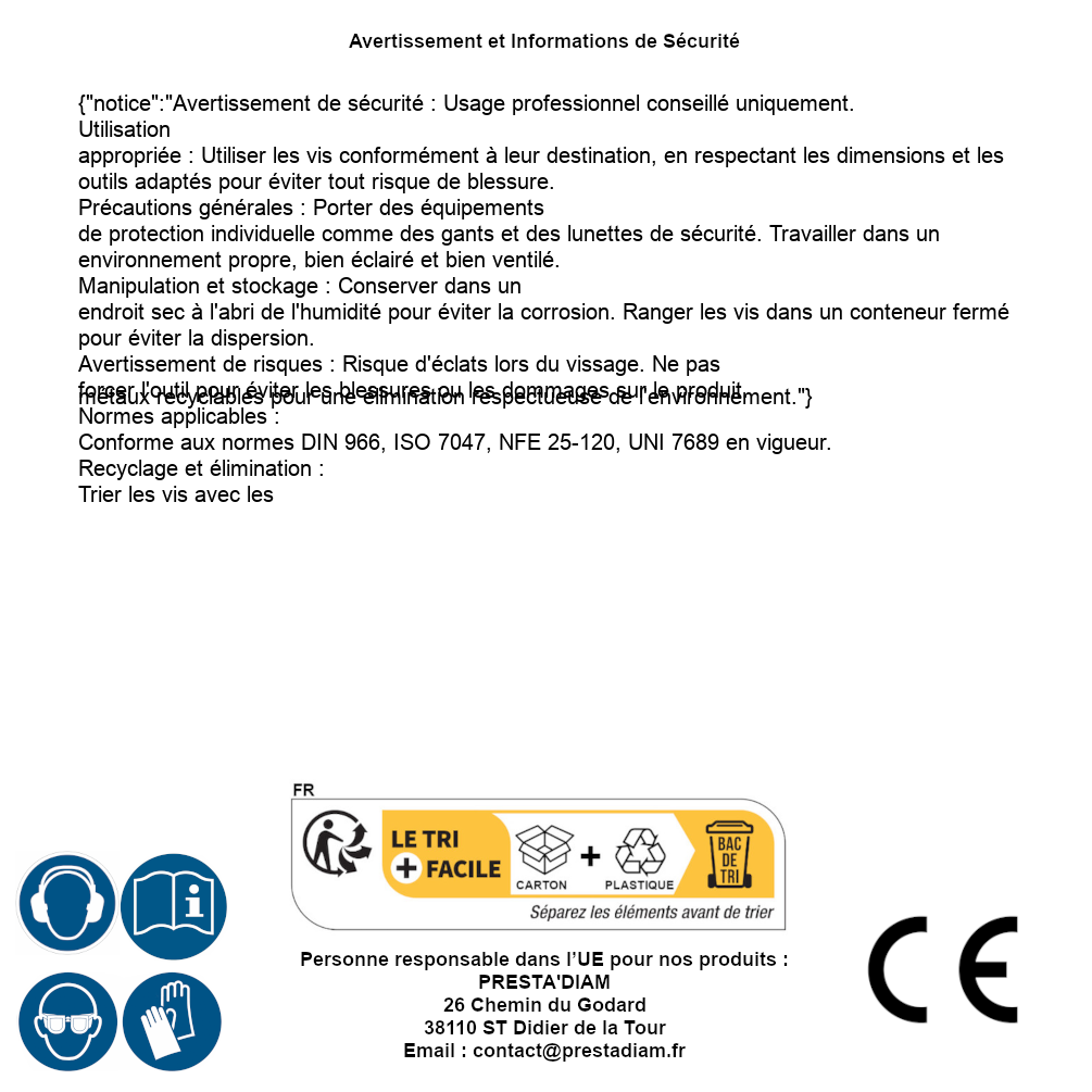 | Verantwortliche Person EU | PRESTA'DIAM 26 Chemin du Godard 38110 ST Didier de la Tour Email: contact@prestadiam.fr |