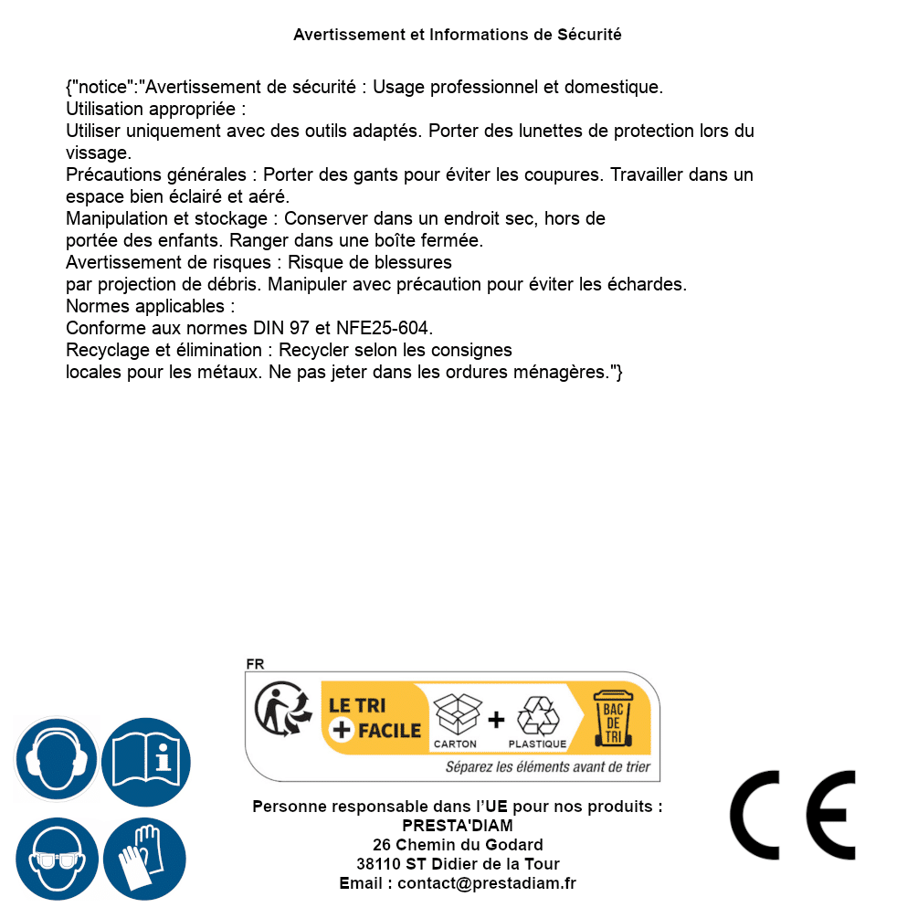 | WARNUNG und SICHERHEIT | Identification de la personne responsable dans l’UE : Nom : PRESTA'DIAM. Adresse : 26 Chemin du Godard, 38110 ST Didier de la Tour (France). Email : contact@prestadiam.fr. |