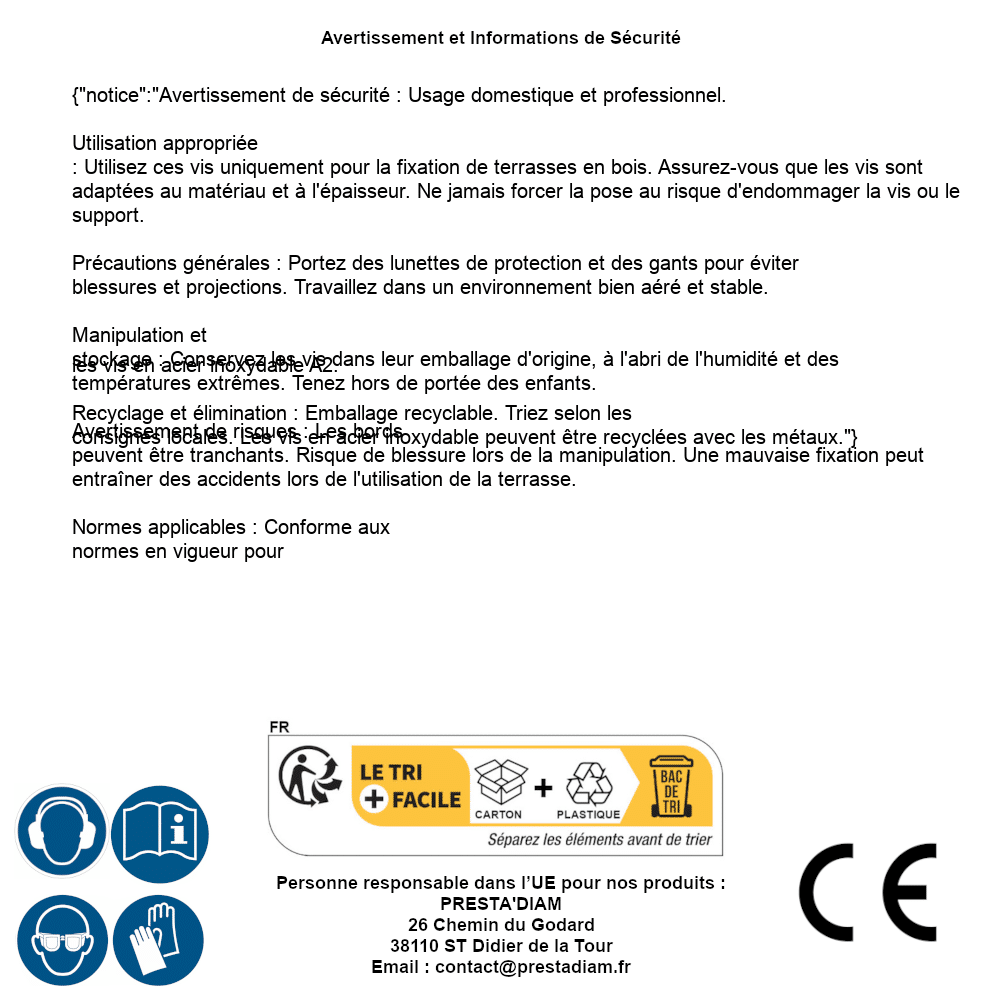 | WARNUNG und SICHERHEIT | Identification de la personne responsable dans l’UE : Nom : PRESTA'DIAM. Adresse : 26 Chemin du Godard, 38110 ST Didier de la Tour (France). Email : contact@prestadiam.fr. |