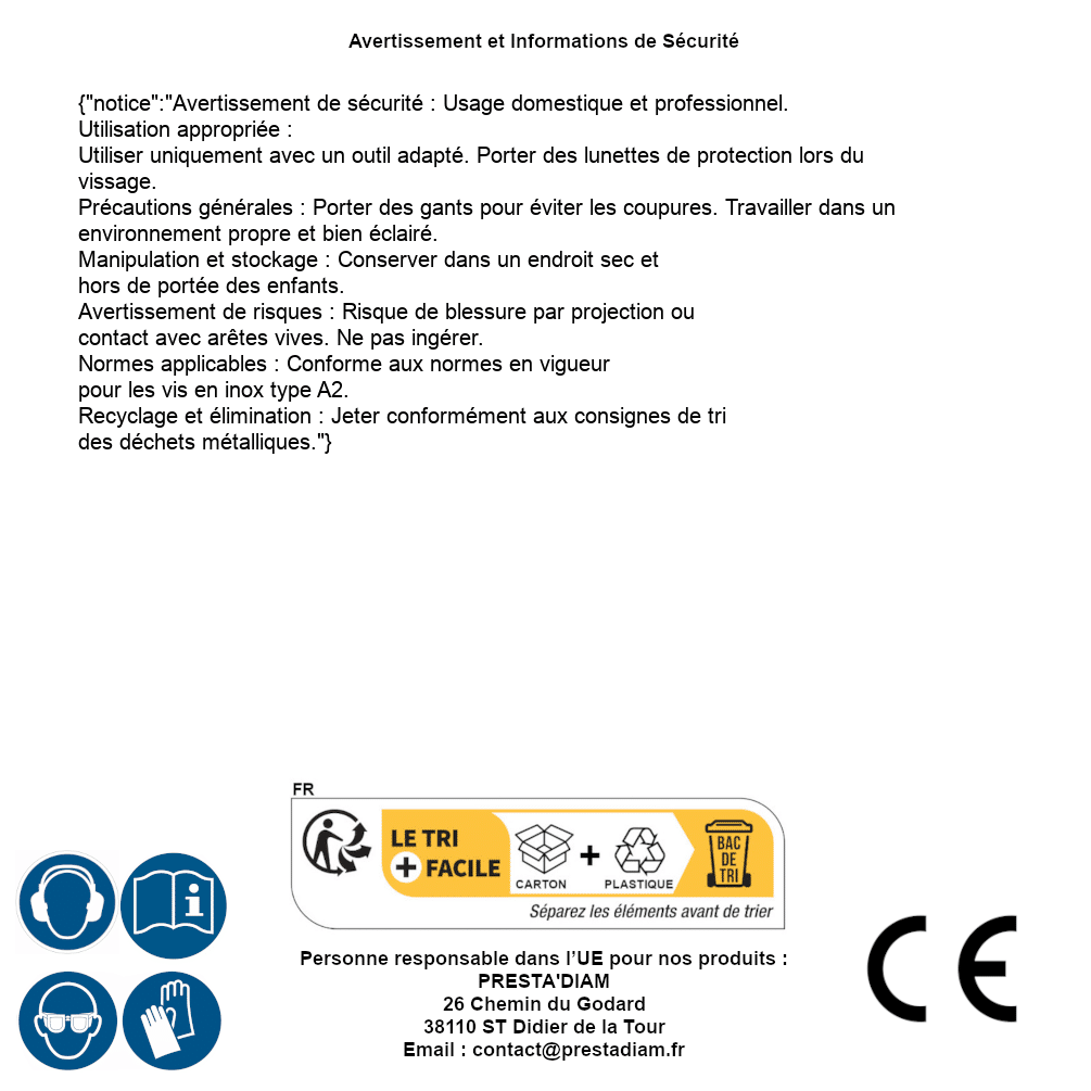 | WARNUNG und SICHERHEIT | Identification de la personne responsable dans l’UE : Nom : PRESTA'DIAM. Adresse : 26 Chemin du Godard, 38110 ST Didier de la Tour (France). Email : contact@prestadiam.fr. |