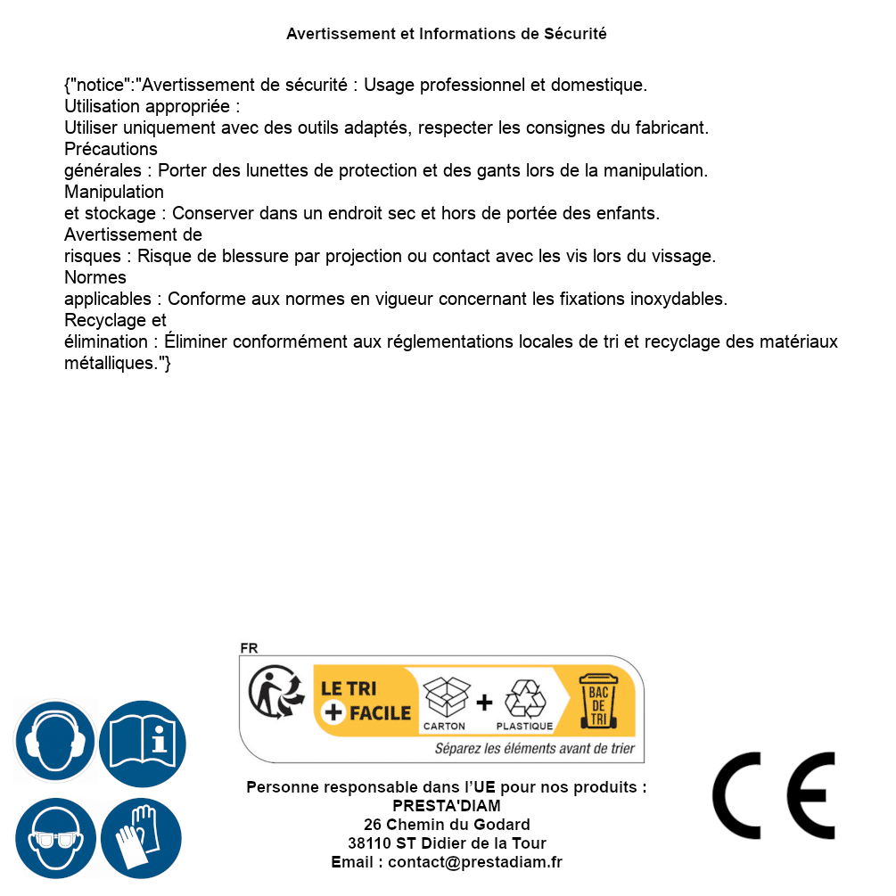 | WARNUNG und SICHERHEIT | Identification de la personne responsable dans l’UE : Nom : PRESTA'DIAM. Adresse : 26 Chemin du Godard, 38110 ST Didier de la Tour (France). Email : contact@prestadiam.fr. |