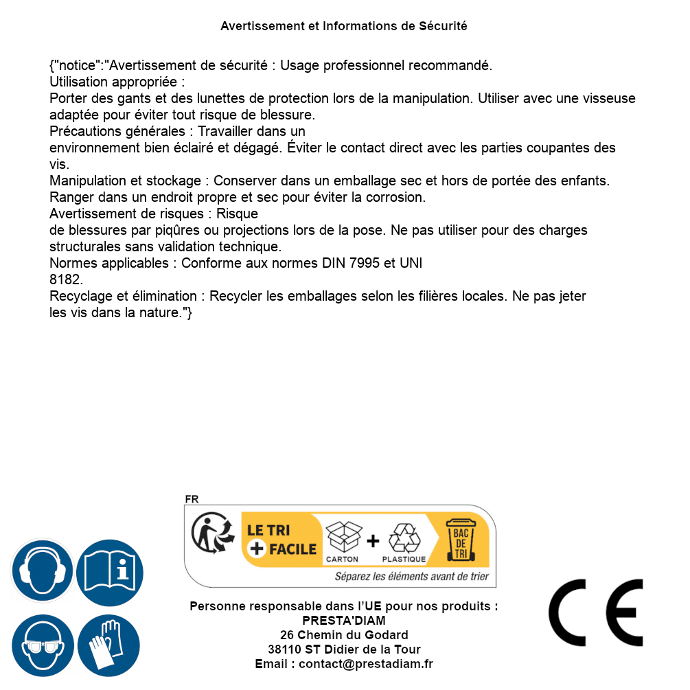 | WARNUNG und SICHERHEIT | Identification de la personne responsable dans l’UE : Nom : PRESTA'DIAM. Adresse : 26 Chemin du Godard, 38110 ST Didier de la Tour (France). Email : contact@prestadiam.fr. |