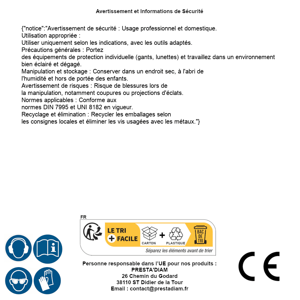 | WARNUNG und SICHERHEIT | Identification de la personne responsable dans l’UE : Nom : PRESTA'DIAM. Adresse : 26 Chemin du Godard, 38110 ST Didier de la Tour (France). Email : contact@prestadiam.fr. |