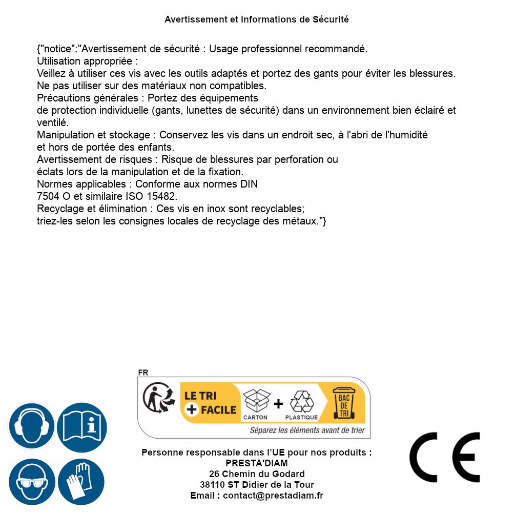 | WARNUNG und SICHERHEIT | Identification de la personne responsable dans l’UE : Nom : PRESTA'DIAM. Adresse : 26 Chemin du Godard, 38110 ST Didier de la Tour (France). Email : contact@prestadiam.fr. |