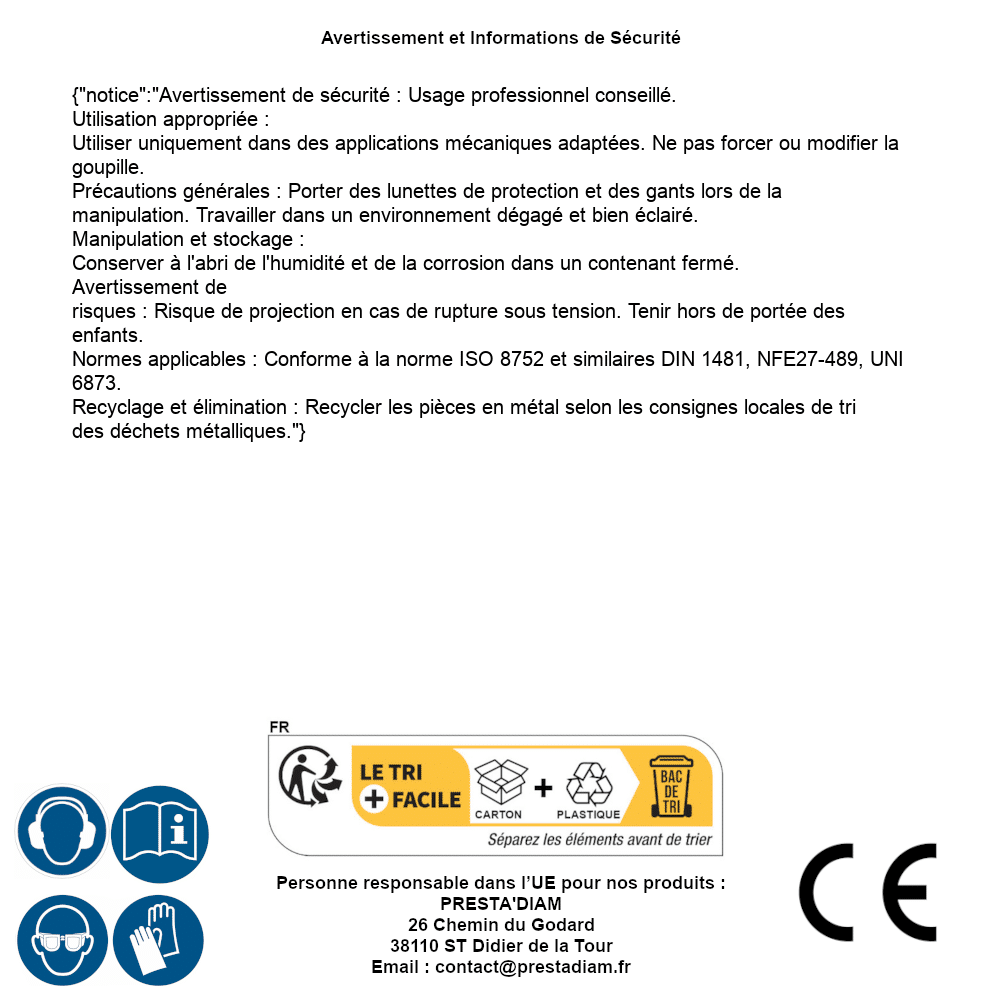 | WARNUNG und SICHERHEIT | Identification de la personne responsable dans l’UE : Nom : PRESTA'DIAM. Adresse : 26 Chemin du Godard, 38110 ST Didier de la Tour (France). Email : contact@prestadiam.fr. |