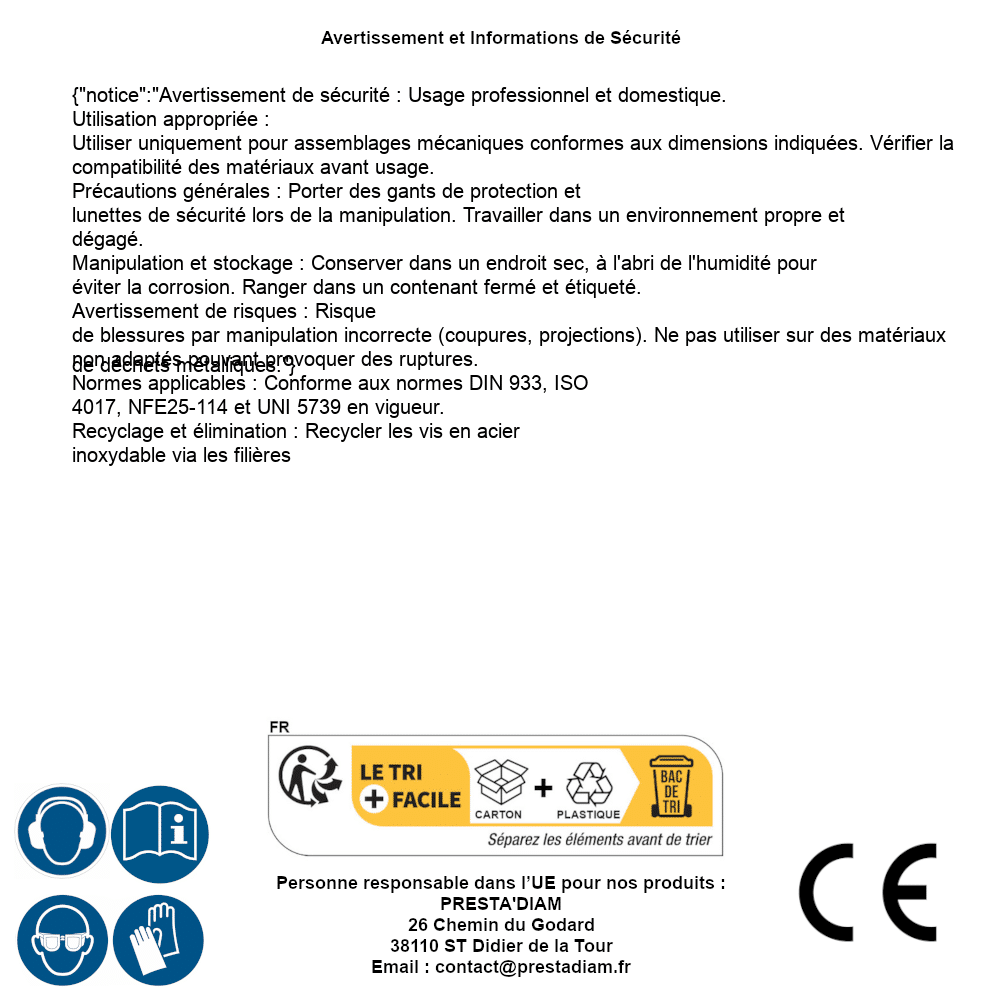 | WARNUNG und SICHERHEIT | Identification de la personne responsable dans l’UE : Nom : PRESTA'DIAM. Adresse : 26 Chemin du Godard, 38110 ST Didier de la Tour (France). Email : contact@prestadiam.fr. |
