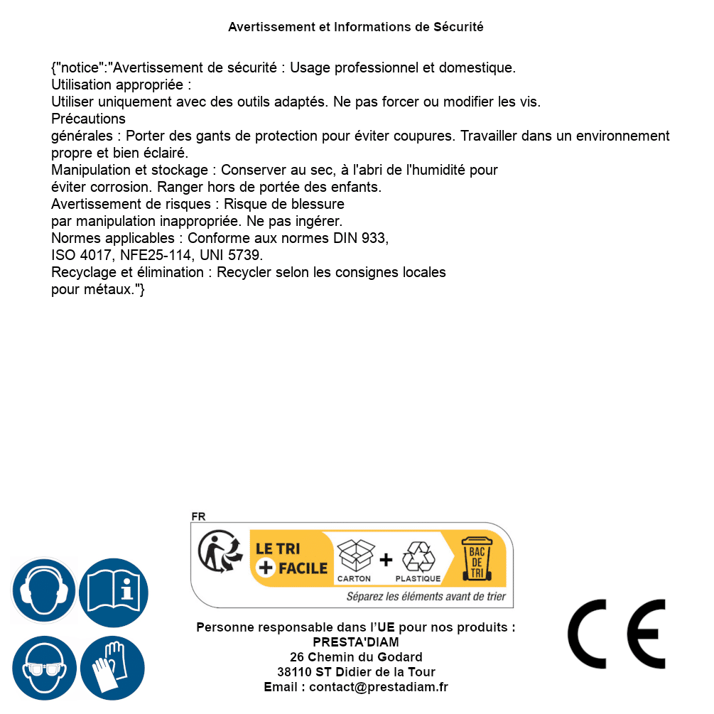 | Verantwortliche Person EU | PRESTA'DIAM 26 Chemin du Godard 38110 ST Didier de la Tour Email: contact@prestadiam.fr |