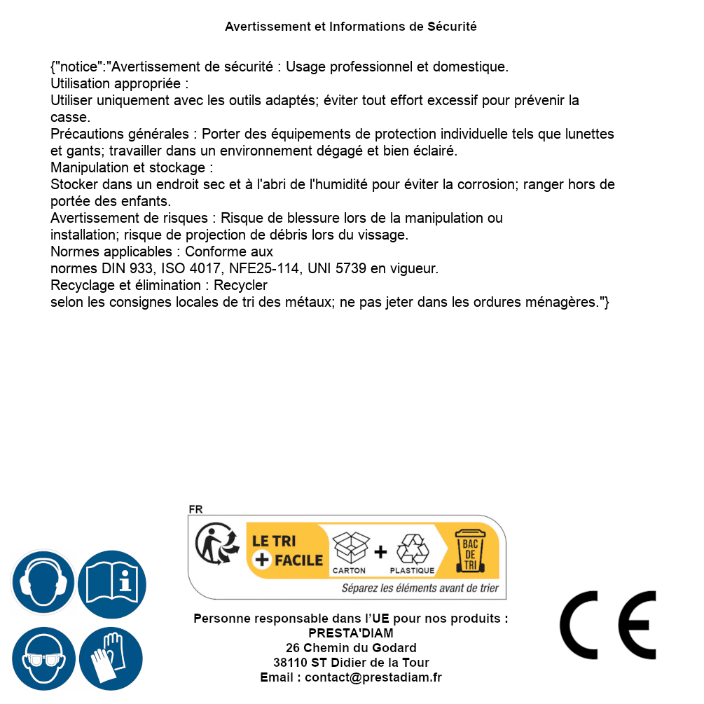 | WARNUNG und SICHERHEIT | Identification de la personne responsable dans l’UE : Nom : PRESTA'DIAM. Adresse : 26 Chemin du Godard, 38110 ST Didier de la Tour (France). Email : contact@prestadiam.fr. |
