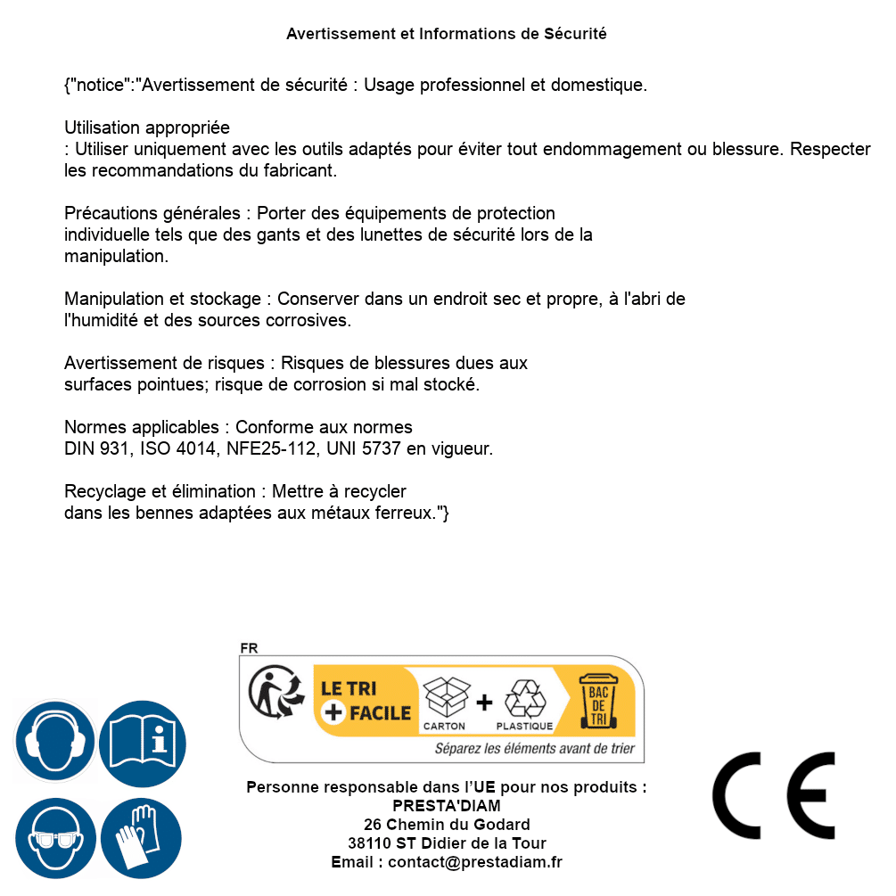 | Verantwortliche Person EU | PRESTA'DIAM 26 Chemin du Godard 38110 ST Didier de la Tour Email: contact@prestadiam.fr |