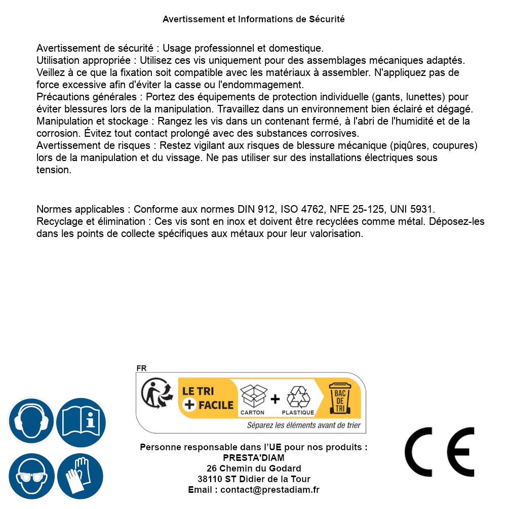 | WARNUNG und SICHERHEIT | Identification de la personne responsable dans l’UE : Nom : PRESTA'DIAM. Adresse : 26 Chemin du Godard, 38110 ST Didier de la Tour (France). Email : contact@prestadiam.fr. |