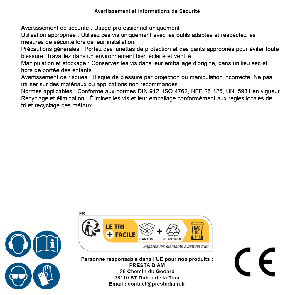 | WARNUNG und SICHERHEIT | Identification de la personne responsable dans l’UE : Nom : PRESTA'DIAM. Adresse : 26 Chemin du Godard, 38110 ST Didier de la Tour (France). Email : contact@prestadiam.fr. |