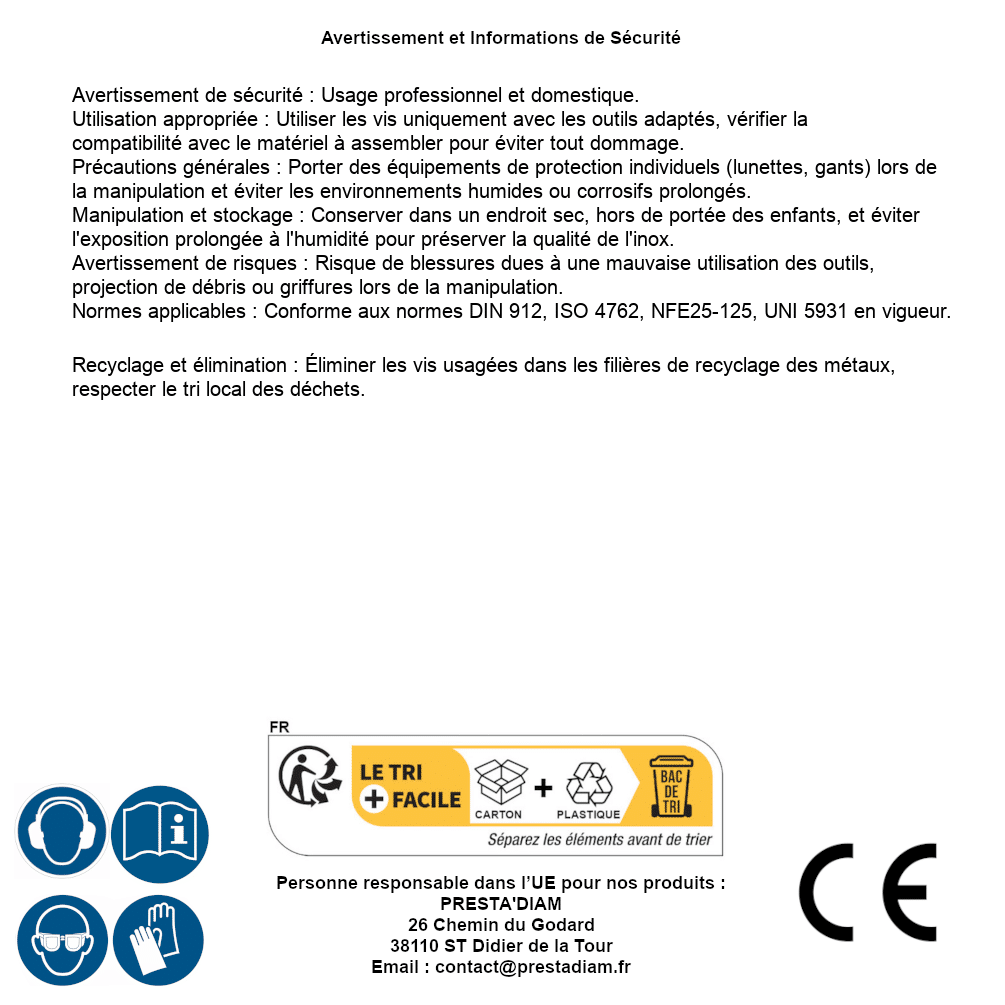 | WARNUNG und SICHERHEIT | Identification de la personne responsable dans l’UE : Nom : PRESTA'DIAM. Adresse : 26 Chemin du Godard, 38110 ST Didier de la Tour (France). Email : contact@prestadiam.fr. |