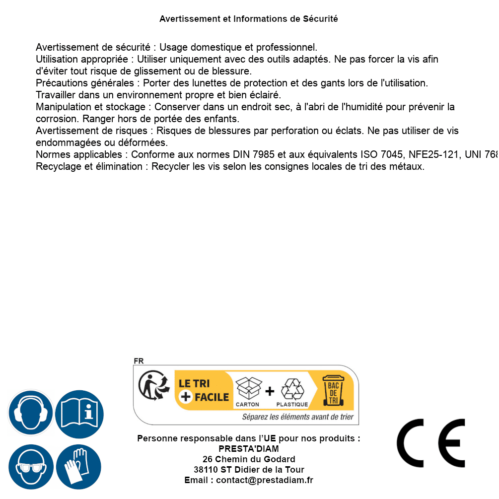 | Verantwortliche Person EU | PRESTA'DIAM 26 Chemin du Godard 38110 ST Didier de la Tour Email: contact@prestadiam.fr |