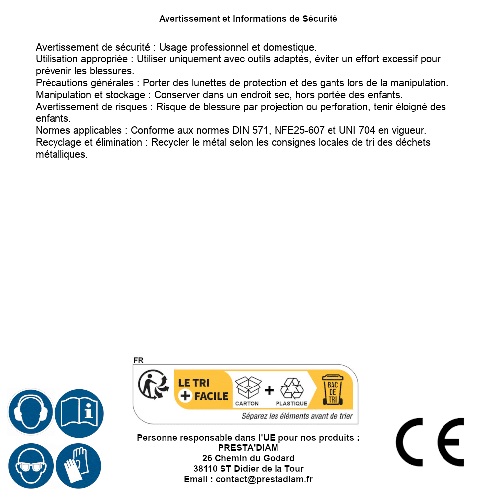 | WARNUNG und SICHERHEIT | Identification de la personne responsable dans l’UE : Nom : PRESTA'DIAM. Adresse : 26 Chemin du Godard, 38110 ST Didier de la Tour (France). Email : contact@prestadiam.fr. |
