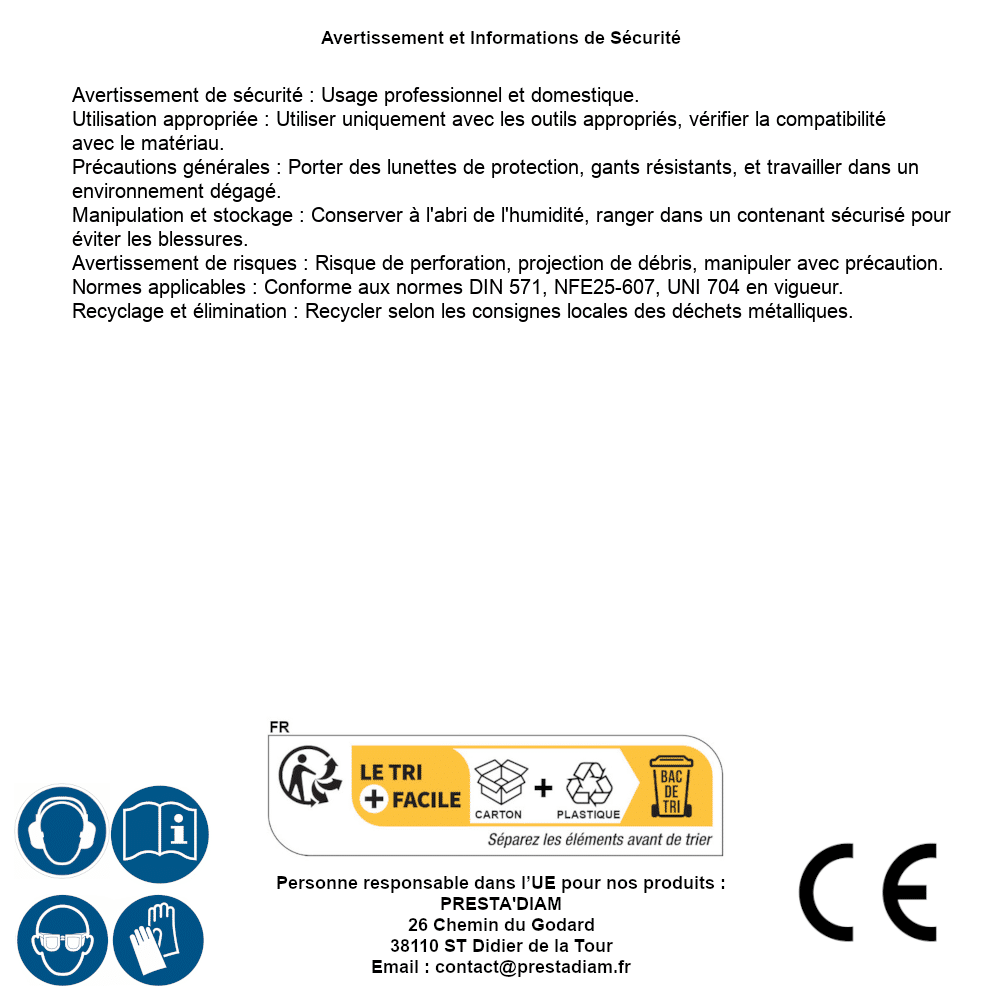 | WARNUNG und SICHERHEIT | Identification de la personne responsable dans l’UE : Nom : PRESTA'DIAM. Adresse : 26 Chemin du Godard, 38110 ST Didier de la Tour (France). Email : contact@prestadiam.fr. |