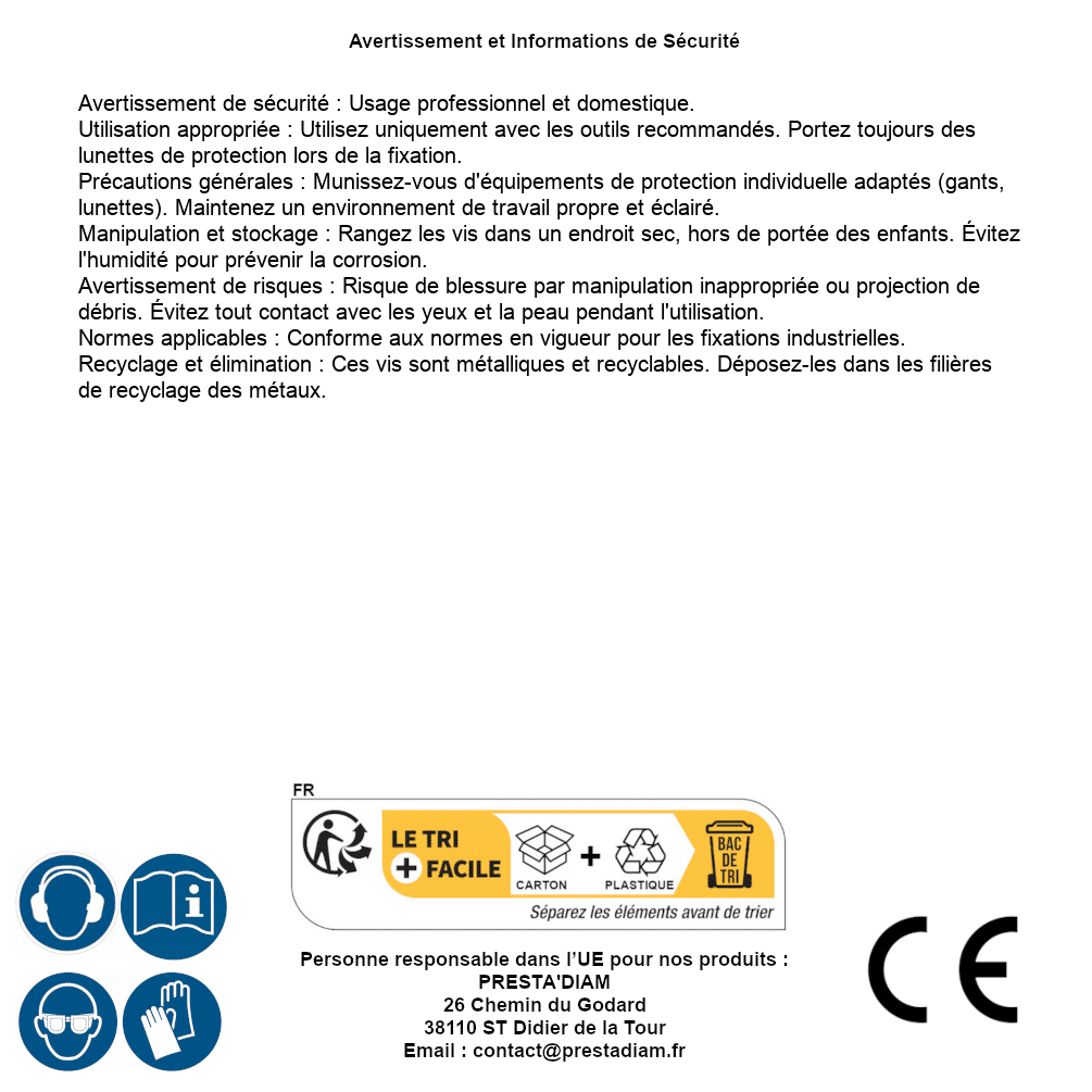 | WARNUNG und SICHERHEIT | Identification de la personne responsable dans l’UE : Nom : PRESTA'DIAM. Adresse : 26 Chemin du Godard, 38110 ST Didier de la Tour (France). Email : contact@prestadiam.fr. |