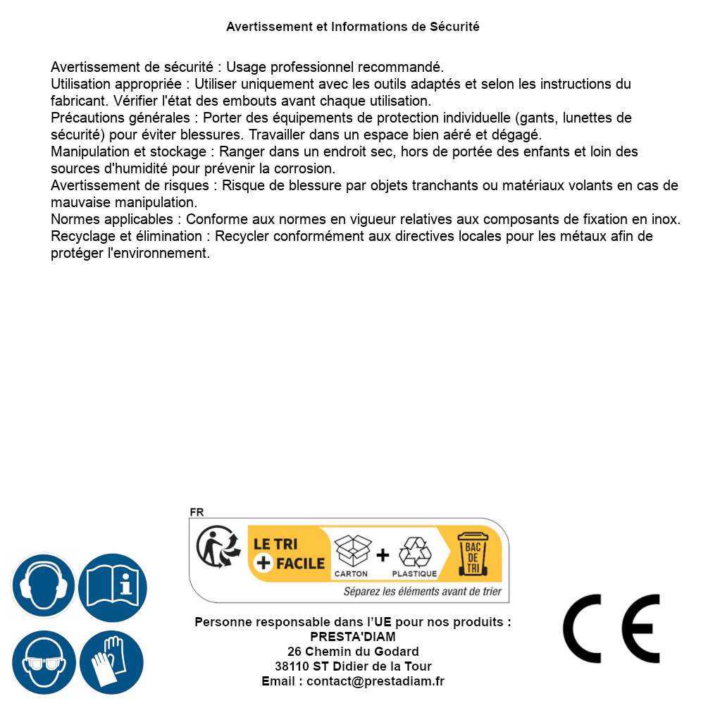 | WARNUNG und SICHERHEIT | Identification de la personne responsable dans l’UE : Nom : PRESTA'DIAM. Adresse : 26 Chemin du Godard, 38110 ST Didier de la Tour (France). Email : contact@prestadiam.fr. |