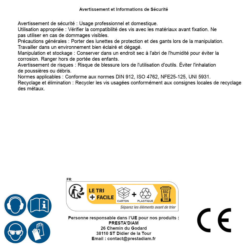 | WARNUNG und SICHERHEIT | Identification de la personne responsable dans l’UE : Nom : PRESTA'DIAM. Adresse : 26 Chemin du Godard, 38110 ST Didier de la Tour (France). Email : contact@prestadiam.fr. |