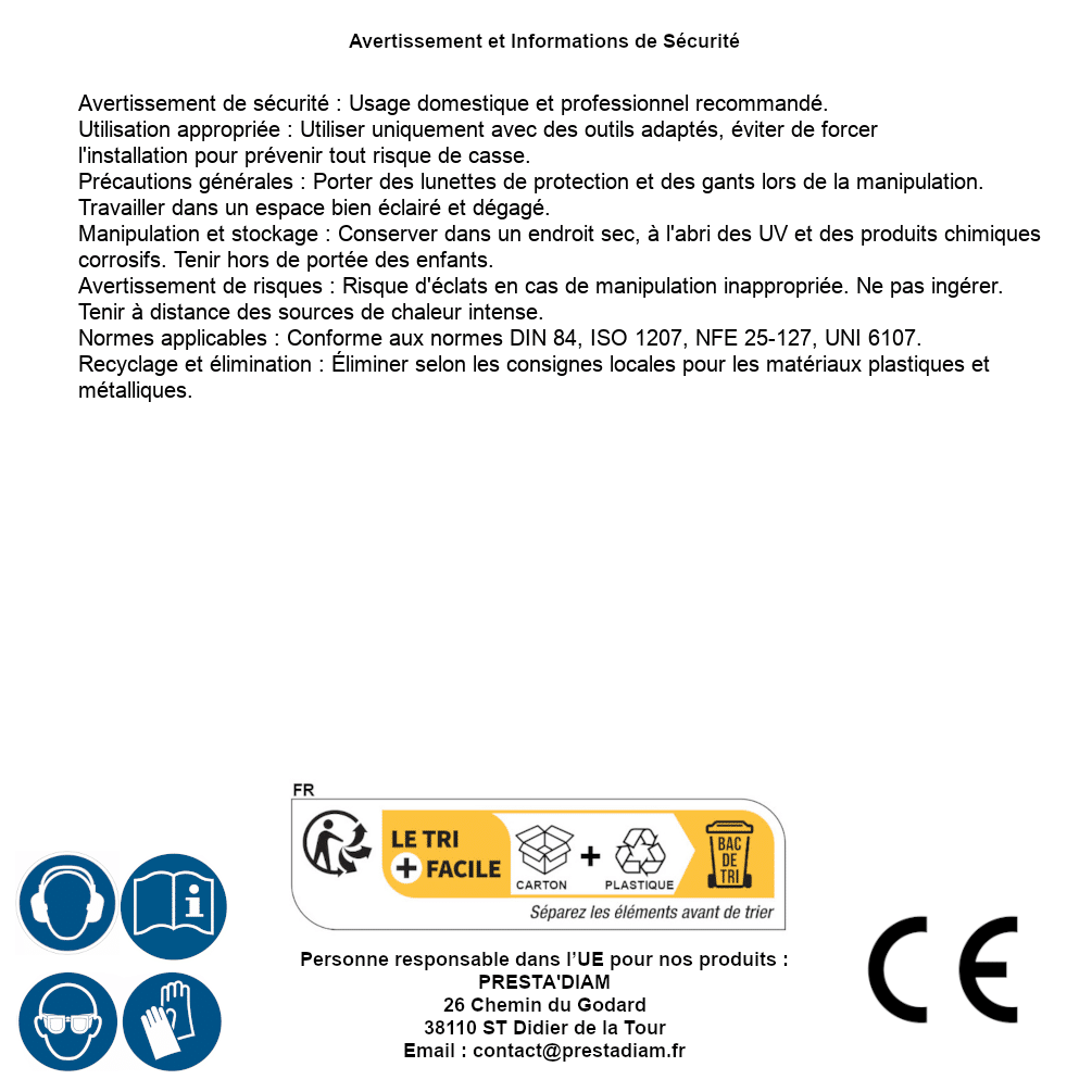 | WARNUNG und SICHERHEIT | Identification de la personne responsable dans l’UE : Nom : PRESTA'DIAM. Adresse : 26 Chemin du Godard, 38110 ST Didier de la Tour (France). Email : contact@prestadiam.fr. |