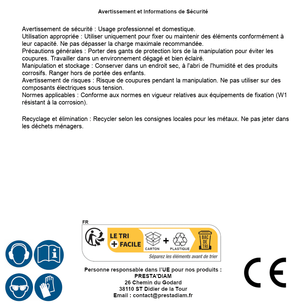 | WARNUNG und SICHERHEIT | Identification de la personne responsable dans l’UE : Nom : PRESTA'DIAM. Adresse : 26 Chemin du Godard, 38110 ST Didier de la Tour (France). Email : contact@prestadiam.fr. |