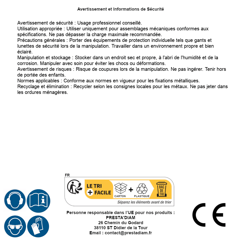 | WARNUNG und SICHERHEIT | Identification de la personne responsable dans l’UE : Nom : PRESTA'DIAM. Adresse : 26 Chemin du Godard, 38110 ST Didier de la Tour (France). Email : contact@prestadiam.fr. |