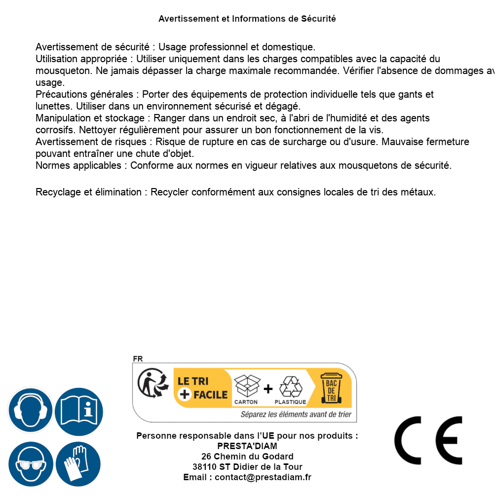 | WARNUNG und SICHERHEIT | Identification de la personne responsable dans l’UE : Nom : PRESTA'DIAM. Adresse : 26 Chemin du Godard, 38110 ST Didier de la Tour (France). Email : contact@prestadiam.fr. |