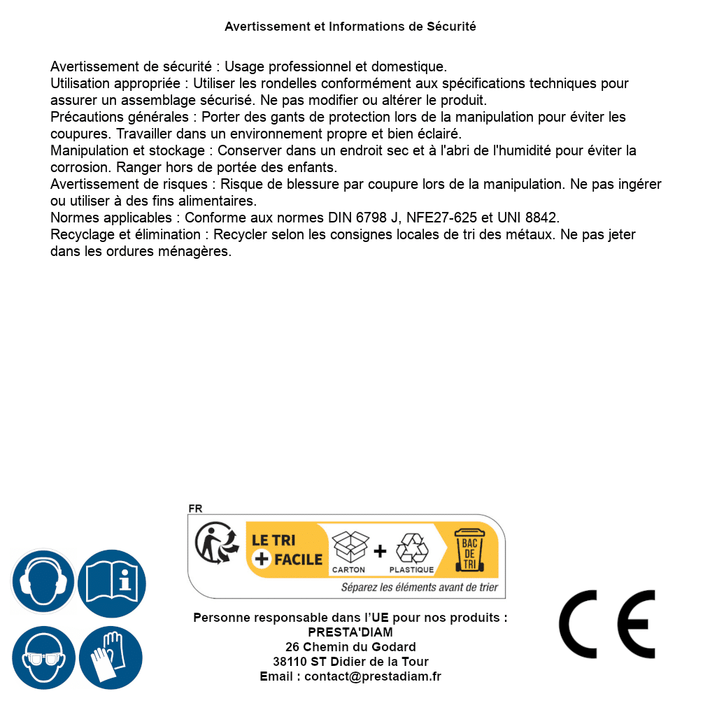 | WARNUNG und SICHERHEIT | Identification de la personne responsable dans l’UE : Nom : PRESTA'DIAM. Adresse : 26 Chemin du Godard, 38110 ST Didier de la Tour (France). Email : contact@prestadiam.fr. |