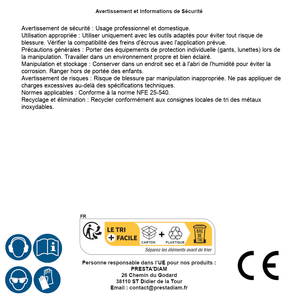 | WARNUNG und SICHERHEIT | Identification de la personne responsable dans l’UE : Nom : PRESTA'DIAM. Adresse : 26 Chemin du Godard, 38110 ST Didier de la Tour (France). Email : contact@prestadiam.fr. |