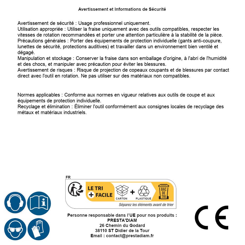 | WARNUNG und SICHERHEIT | Identification de la personne responsable dans l’UE : Nom : PRESTA'DIAM. Adresse : 26 Chemin du Godard, 38110 ST Didier de la Tour (France). Email : contact@prestadiam.fr. |