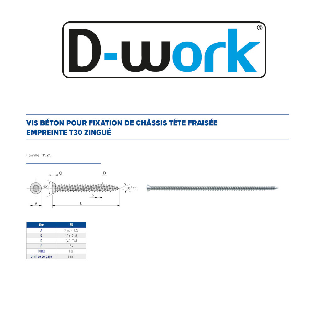100 Vis à Béton d'Ancrage TF Torx 7.5x152 mm – Zingué Blanc – Fixation Sécurisée et Durable - LENNIE