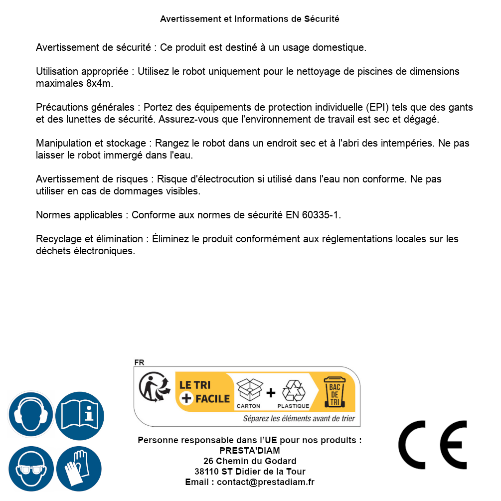 | ADVERTENCIA y SEGURIDAD | Avertissement de sécurité : Ce produit est destiné à un usage domestique.Utilisation appropriée : Utilisez le robot uniquement pour le nettoyage de piscines de dimensions maximales 8x4m.Précautions générales : Portez des équipements de protection individuelle (EPI) tels que des gants et des lunettes de sécurité. Assurez-vous que l'environnement de travail est sec et dégagé.Manipulation et stockage : Rangez le robot dans un endroit sec et à l'abri des intempéries. Ne pas laisser le robot immergé dans l'eau.Avertissement de risques : Risque d'électrocution si utilisé dans l'eau non conforme. Ne pas utiliser en cas de dommages visibles.Normes applicables : Conforme aux normes de sécurité EN 60335-1.Recyclage et élimination : Éliminez le produit conformément aux réglementations locales sur les déchets électroniques. Identification de la personne responsable dans l’UE : Nom : PRESTA'DIAM. Adresse : 26 Chemin du Godard, 38110 ST Didier de la Tour (France). Email : contact@prestadiam.fr. |