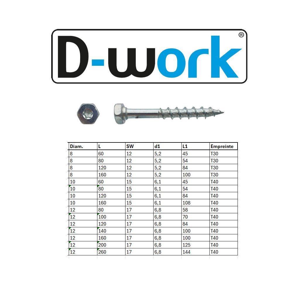 50 Tornillos para madera de cabeza hexagonal (TH) 10 x 100 mm Acero cincado DIN 571 - (francés) D-Work