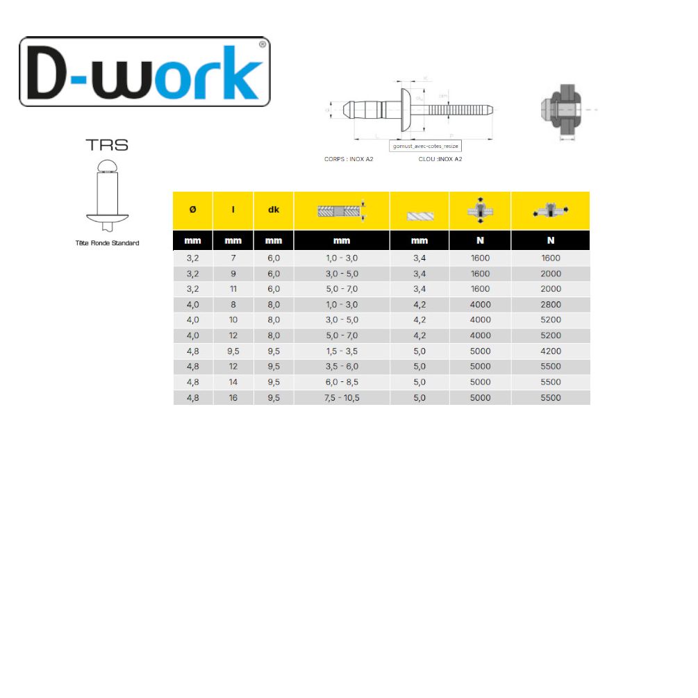 500 Rivets Aveugles Aluminium/Acier TR Gorivet ALX TRS 3.2x8 mm - Résistants et Faciles à Poser - D-Work