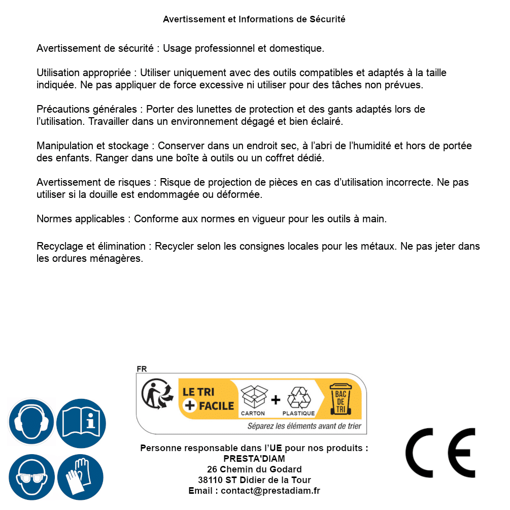 | ADVERTENCIA y SEGURIDAD | Identification de la personne responsable dans l’UE : Nom : PRESTA'DIAM. Adresse : 26 Chemin du Godard, 38110 ST Didier de la Tour (France). Email : contact@prestadiam.fr. |