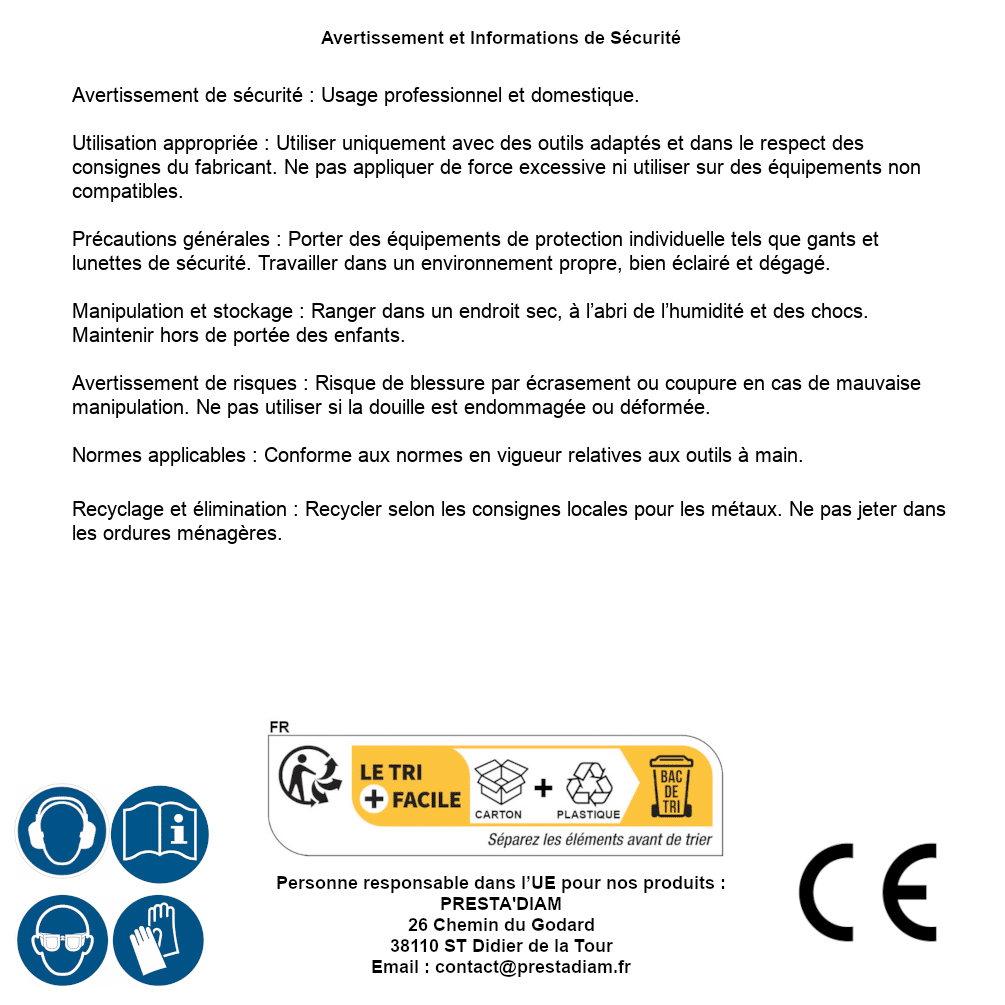 | ADVERTENCIA y SEGURIDAD | Identification de la personne responsable dans l’UE : Nom : PRESTA'DIAM. Adresse : 26 Chemin du Godard, 38110 ST Didier de la Tour (France). Email : contact@prestadiam.fr. |